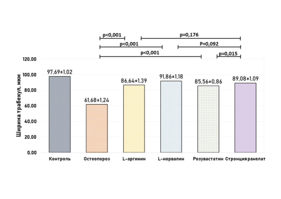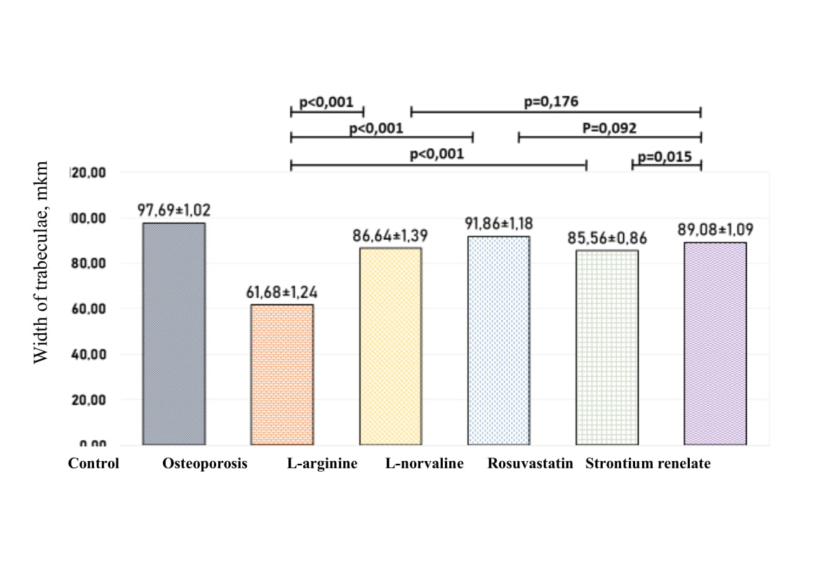 Fig. 2. Results of influence of L-arginine, L-norvaline, rosuvastatin and strontium renelate on the average width of trabeculae of proximal metaphysis of femoral bone in 8 weeks after bilateral ovariectomy