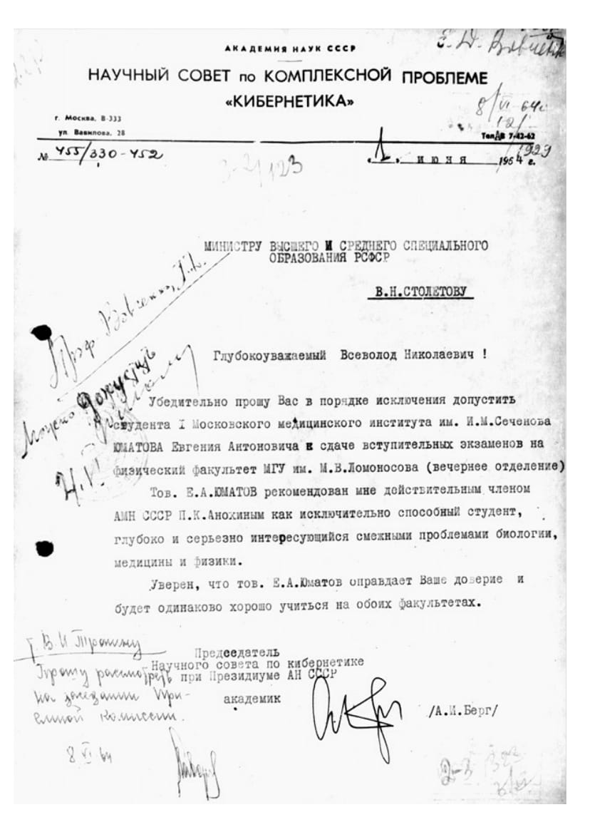 P.K. Anokhin did not turn a deaf ear to my request and wrote a letter to Vice-President of the Academy of Sciences of the USSR, academician A.I. Berg, who in histurn addressed the Minister of Higher and secondary education and asked him to give me a chance to enter the department of eve-ning studies of the physic faculty of M.V. Lomonosov MSU. The Minister agreed and on an exceptional basis sent a letter to M.V. Lomonosov MSU (Figure 1). Then I passed the entrance exams on the same basis as everyone else, and, fortunately, entered the university and began to study at two higher educational institutions: at the medical at daytime, and at the physical faculty in the evening. I should say, it was very difficult to study because there often happened to be two simultaneous non-coordinated with each other examination sessions: for example, today I had an exam on obstetrics, and tomorrow my exam was on higher mathematics. In this way the first fateful period in my life started that was determined by P.K. Anokhin.
