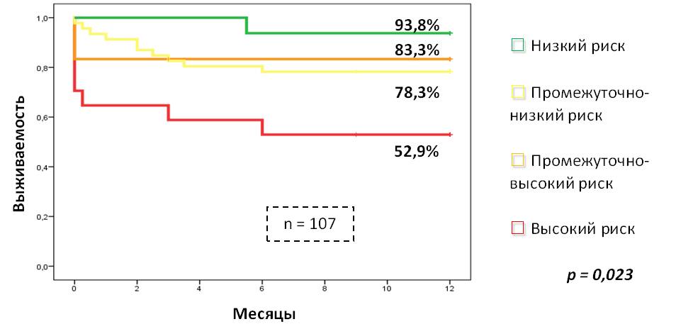 Высокий риск по интегральной оценке тяжести и риска ранней смерти11 | 9,9 | (1,2; 79,5) | 0,031 |