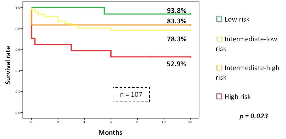 Второе место среди предикторов летального исхода в течение 12 месяцев после перенесенной ТЭЛА занял фактор «возраст ≥ 65 лет» (табл. 4). На первое место, набрав достаточную статистическую мощность за 12-месячный период, вышел фактор «высокий риск по ИОТРРС» (табл. 4). Его наглядное влияние на выживаемость пациентов с ТЭЛА в течение всех 12 месяцев отражено на рисунке 1. Помимо этого, для неблагоприятного 12-месячного прогноза выявлены собственные предикторы — «потребность в петлевых диуретиках» и «наличие синдрома S1Q3 на электрокардиограмме (ЭКГ)» (табл. 4).