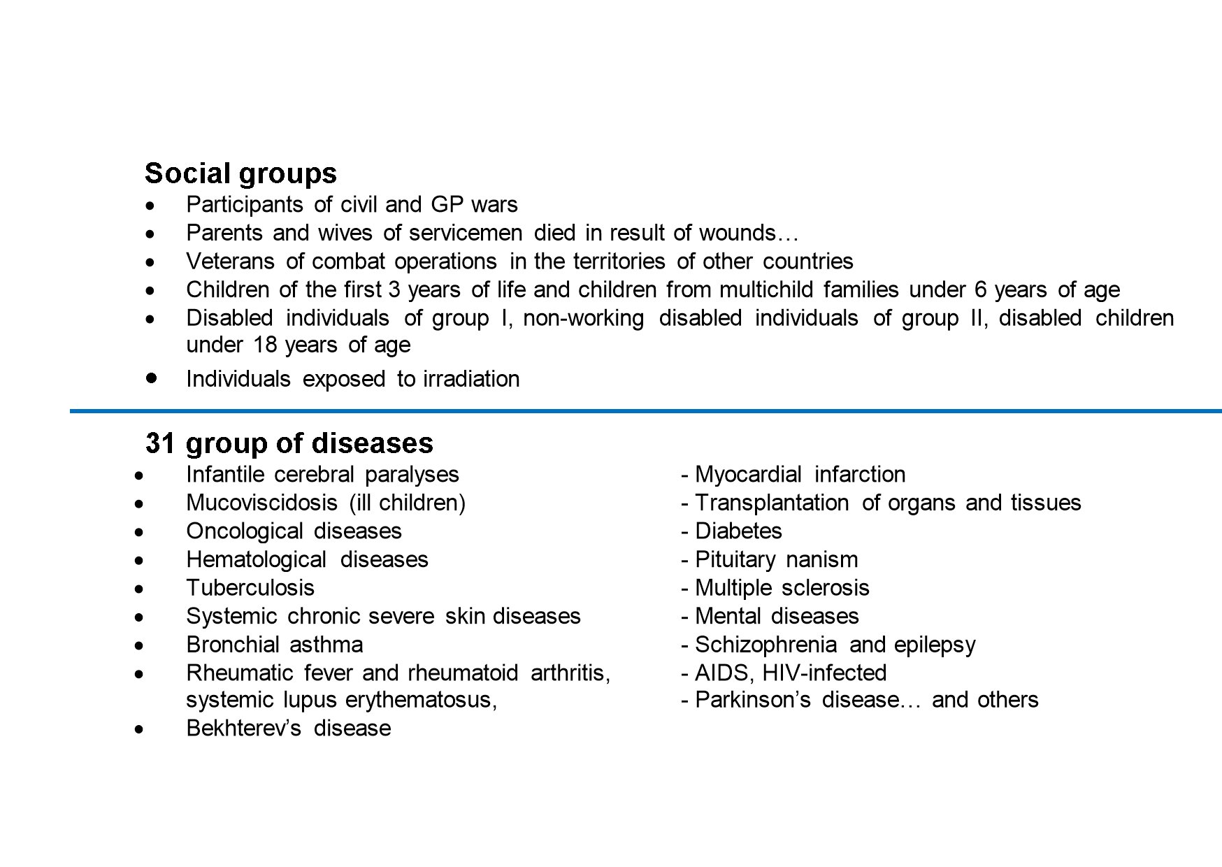 …provision with MD according to the List of groups of population and categories of diseases, in outpatient treatment of which medical drugs and medical products are dispensed on prescription free of charge;