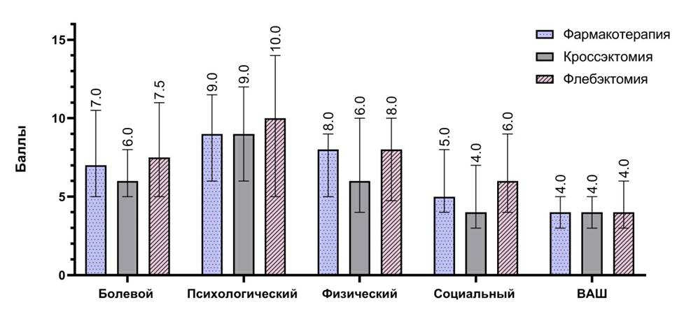 RESULTS: All the studied treatment methods demonstrated a comparative clinical effectiveness. Analysis of the dynamics of the studied parameters (adjusted for gender and age of the patients) compared with their initial values within each group showed that statistically significant changes in the psychological factor were observed in the pharmacotherapy group already on the 7th control day (p = 0.024), while in the crossectomy and phlebectomy groups only on the 14th day. In the groups of pharmacotherapy (p = 0.001) and phlebectomy (p = 0.005), the improvement in terms of the social factor occurred faster than in the group of crossectomy, since statistically significant differences were found on the 7th day, and in the group of crossectomy only on the 14th day.