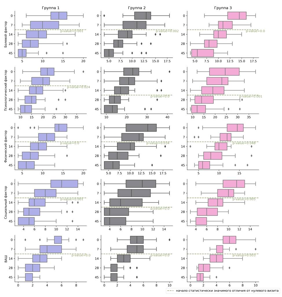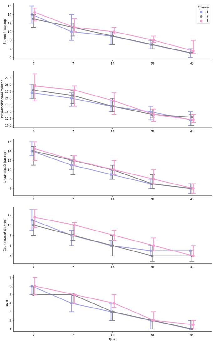 Statistically significant changes of the pain factor were observed after the seventh day of observation in all the groups (p = 0.002). Statistically significant changes in the psychological factor were observed after the seventh day of observation in the group of pharmacotherapy (p = 0.020), while in group 2 and 3 statistically significant changes were observed only in fourteen days from the moment of observation (p = 0.001).