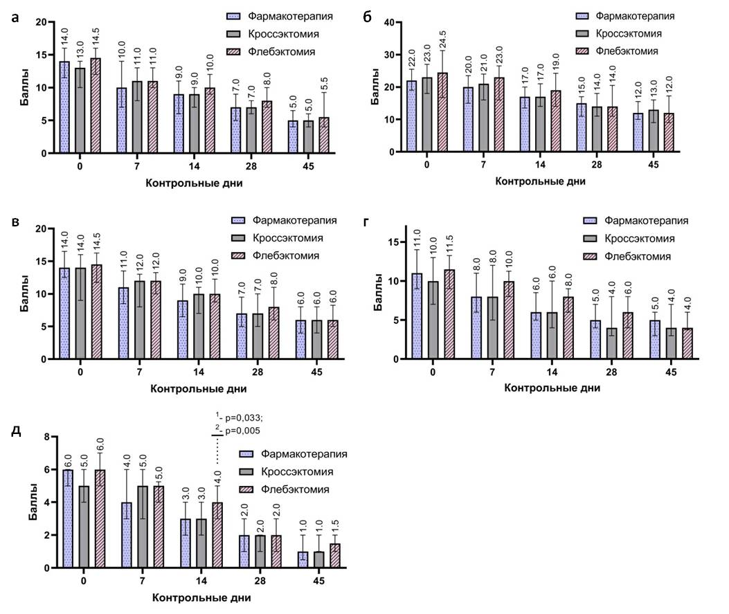 Notes: 1 — compared with the pharmacotherapy group on the given control day; 2 — compared with the crossectomy group on the given control day; the numbers above the columns are Median values.