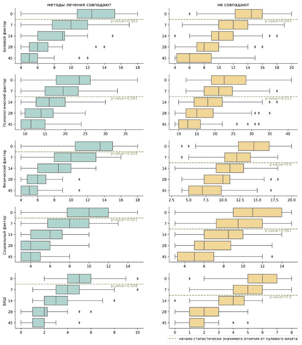 Fig. 7. Dynamics of normalization of pain, psychological, physical, social factors and parameters of the visual-analog scale in patients in whom the treatment tactics used and the treatment tactics proposed on the basis of the predictive model coincided and did not coincide (with corrections for gender and age of patients).