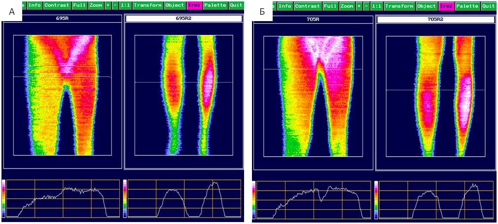 With a high level of objectification, the following changes of the quantitative parameters of infrared radiation of a pathologically altered limb were obtained: left inguinal region — 39.02 ± 0.17°С, popliteal region 37.86 ± 0.13°С, respective regions on the right — 37.93 ± 0.16°С and 38.96 ± 0.19°С. The thermal asymmetry was characterized by peculiarities of arrangement of vessel trunks and innervation of the limb (Table 4). Evaluation of thermography parameters of LL showed increase in the level of IR radiation only in Group 2. Increase (р < 0.001) in the area of hyperthermia in the distal part of lower legs and along the inner surface of thighs was recorded evidencing improvement of microcirculation (Figure 1).