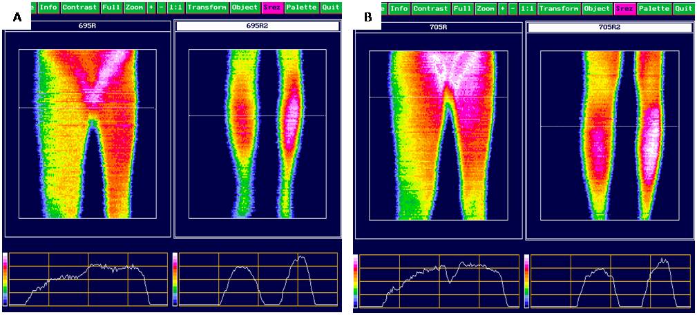 Fig. 1. Clinical example: Thermograms of lower limbs of a female patient S., 58 years old, with III stage secondary lymphedema before (A) and after (B) comprehensive treatment.
