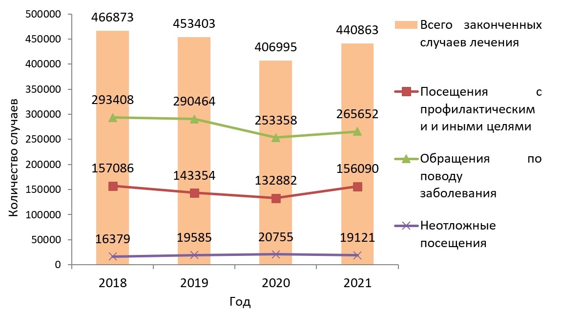 Рис. 1. Динамика количества законченных случаев лечения при оказании стоматологической помощи населению Рязанской области в рамках территориальной программы обязательного медицинского страхования в 2018–2021 гг. в зависимости от цели посещения.