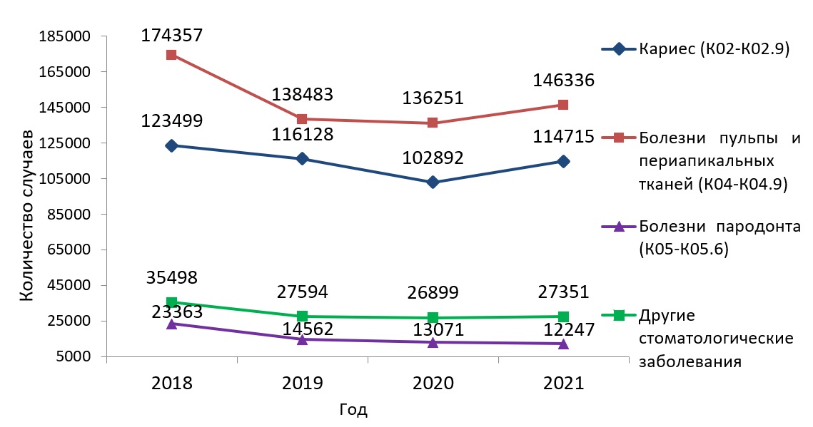 Основной причиной обращаемости населения за медицинской помощью по профилю «стоматология» оставалась потребность проведения обследования. В структуре стоматологической заболеваемости первое место на протяжении всего изучаемого периода занимал кариес дентина, второе — хронический апикальный периодонтит, третье — пульпит. Выявлено увеличение законченных случаев лечения пульпита и периапикального абсцесса без свища в структуре стоматологической заболеваемости в 2020 г. по сравнению с показателями 2019 г. при общем сокращении объемов стоматологической помощи. Ситуация изменилась в 2021 г. — в период снижения новой коронавирусной инфекции — при увеличении обращаемости населения за стоматологической помощью в связи с ростом стоматологической патологии.