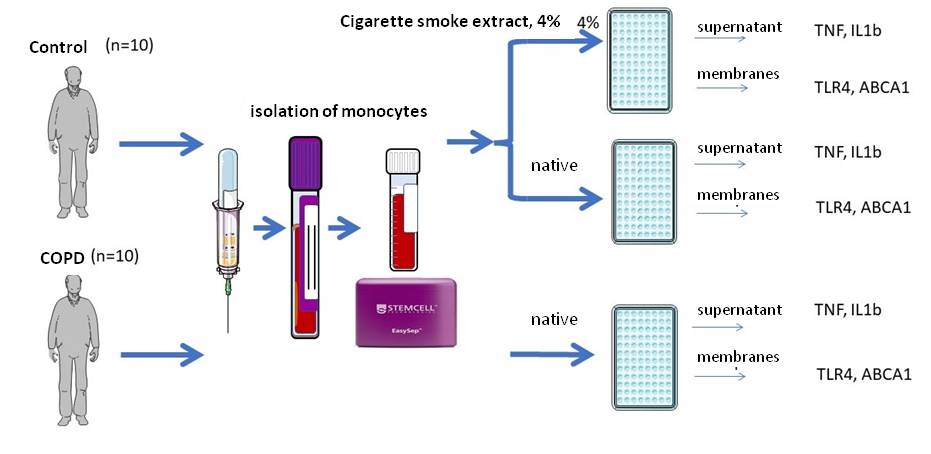CONCLUSION: Cigarette smoke enhances the production of proinflammatory TNF-α and IL-1β cytokines, increases the levels of TLR4 protein and reduces the amount of ABCA1 transporter in membranes of monocytes of peripheral blood. This may partially explain the cause of the influence of cigarette smoke on development of the pulmonary and cardiovascular diseases. COPD with frequent exacerbation phenotype and OALLA are characterized by enhancement of inflammation with participation of monocytes.
