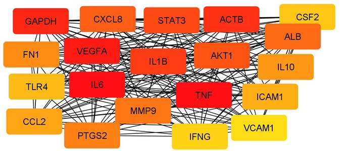 Fig. 3. The identified most significant genes associated with the effect of tobacco smoke. Note: the important genes are ranked in the following way: the most important genes are marked red, less important — orange, least important — yellow.