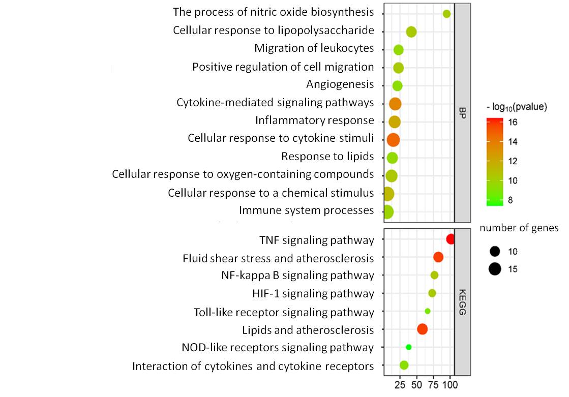 Fig. 4. Identified biological processes (BPs) and signaling pathways by Kyoto Encyclopedia of Genes and Genomes (KEGG). Notes: TNF — tumor necrosis factor, HIF-1 — hypoxia-inducible factor-1, NF kappa B — nuclear factor kappa B, NOD — nucleotide-binding oligomerization domain.