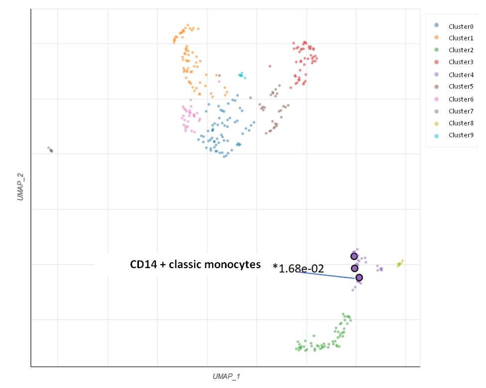 Then, using the data obtained from Azimuth Cell Types 2021 library in Enrichr, the cell types associated with the most significant genes were identified. Among the Leiden clusters presented in Figure 5, characterizing various cell types, the most significant cells associated with the identified genes were CD14 + classic monocytes (Figure 5).