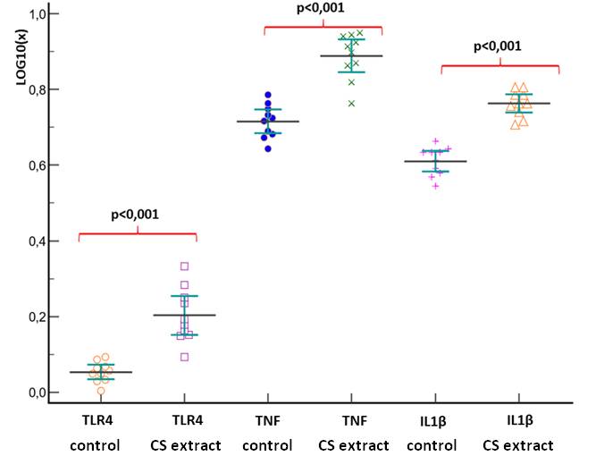 Fig. 6. A graph of changes of TLR4, TNF and IL1β before and after exposure to cigarette smoke extract. Notes: control — control group, CS extract — group of exposure to CS extract; data are given in the form of — log10 of values; CS — cigarette smoke, TLR4 — toll-like receptor 4, TNF-α — tumor necrosis factor alpha, IL-1β — Interleukin-1β.