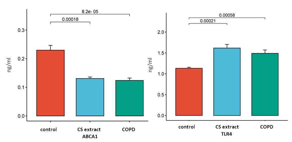 In in vitro experiment, we found that stimulation of macrophages with CS extract leads to enhanced release of TNF-α and IL-1β into the culture medium, increased membrane levels of TLR4 and decreased membrane levels of ABCA1. With this, higher levels of TLR4 and lower levels of ABCA1 were found in the membrane fraction of peripheral blood monocytes of COPD patients with the 'frequent exacerbator' phenotype and OALLA compared to the control.