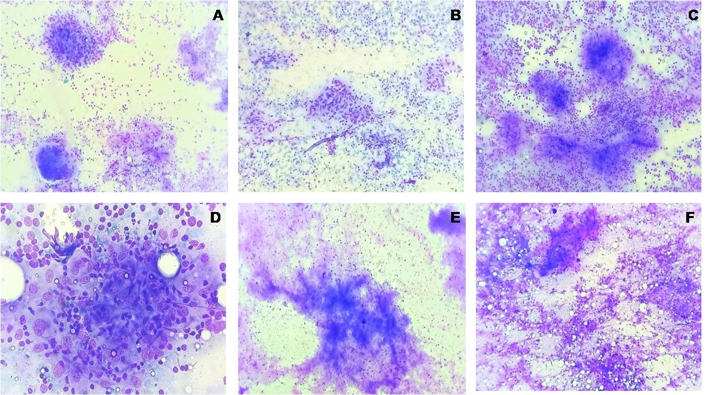 Fig. 1. Cytomorphological patterns: epithelioid granulomas with Langhans giant cells and caseous necrosis (Giemsa, ×10) (A); only numerous epithelioid cells and granulomas in a reactive background (Giemsa, ×10) (B); caseous necrosis with few epithelioid cells (Giemsa, ×10) (C); caseous necrosis with few epithelioid cells (Giemsa, ×40) (D); caseous necrosis with few lymphocytes and histiocytes, no epithelioid cells (Giemsa, ×10) (E); tubercular abscess showing predominantly neutrophils along with epithelioid cells (Giemsa, ×10) (F)