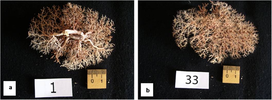 Fig. 1. Examples of corrosion preparations of the spleen: (a) a man, 31 years old; (b) a man, 60 years old.