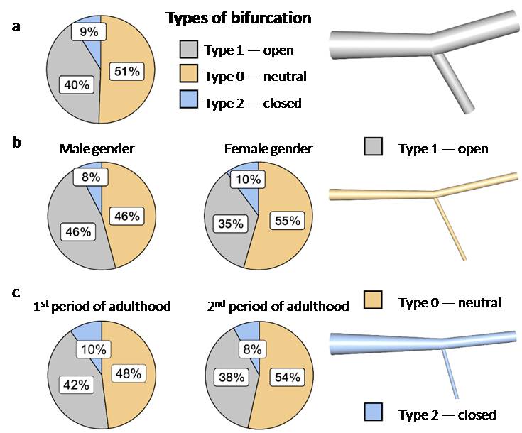 The results of a comparative analysis of the relative number of various types of bifurcations in persons of different gender and age groups (first and second periods of adulthood) are shown in Figures 2b, 2c. The relative number of open bifurcations in the intraorgan arterial bed of spleen was slightly higher in men (46%) than in women (35%). In contrast, the number of neutral bifurcations was higher in the group of women (55%) than of men (46%). The relative number of closed bifurcations differed insignificantly: 8% in men and 10% in women. Neutral bifurcations predominated in the groups of the first and second periods of adulthood with a small difference: 54% in the second period and 48% in the first. The relative number of open and closed bifurcations was higher in the first adult period (42% and 10%, respectively) than in the second (38% and 8%).