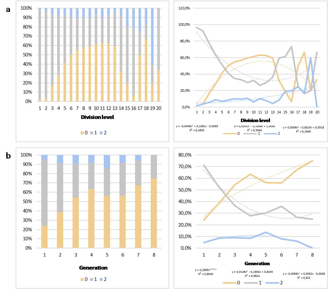 For assessing the differences in the groups, Kruskal–Wallis test for independent samples was used. In the work, medians, 95% confidence interval (CI) of median (Me) and relative number of categorical values were determined on different generations and division levels. The statistical analysis was performed using the R language.