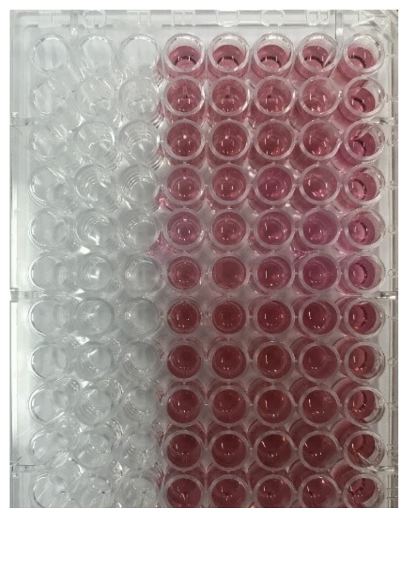 Fig. 2. 96-well plate with cell supernatant after incubation with MTS/PMS before measurement of optical density