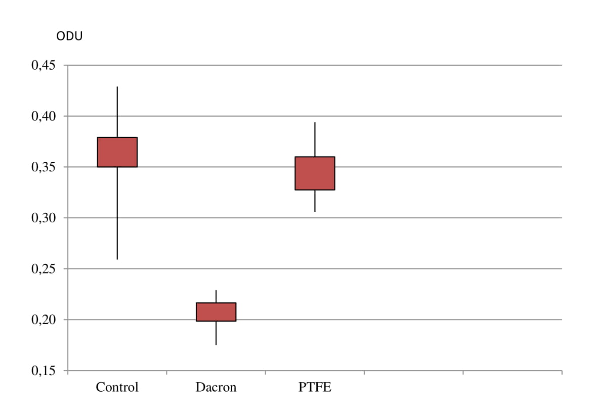 The lowest average values of optical density in the supernatant were noted in Dacron group – 0.21 (0.2-0.22) optical density units (ODU), the highest values were noted in the control group 0.36 (0.35-0.38) ODU; parameters in PTFE group were 0.35 (0.33-0.36) ODU. Comparison of the studied groups showed statistically significant differences between the control and Dacron groups (р<0.001), control and PTFE (р=0.037), Dacron and PTFE (р<0.001, Figure 3).