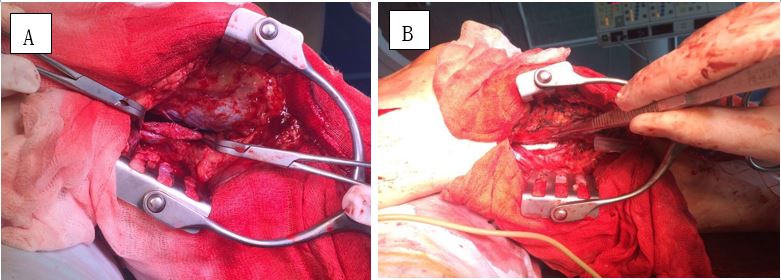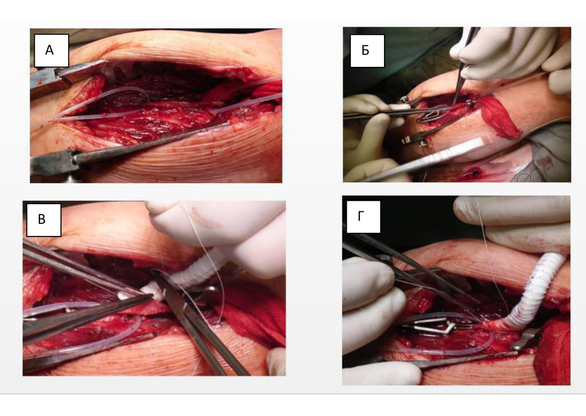 图6。70岁M.病人的手术干预阶段:A—大面积动脉切开术的补片形成;B—补片和人工假体之间进行端到侧的吻合
