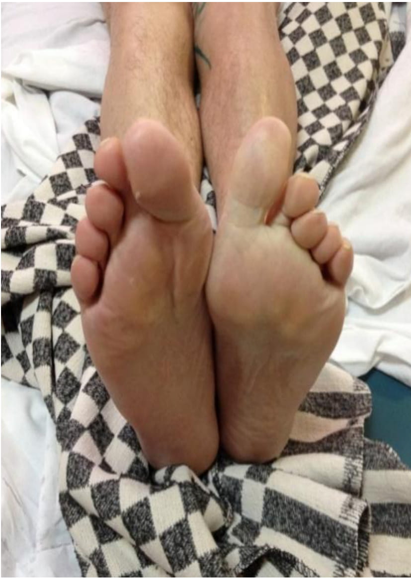 Fig. 4. Disorder in microcirculation of the left foot of patient M., 70 years old, in the form of pronounced paleness of skin in the horizontal position