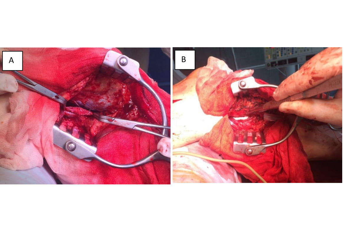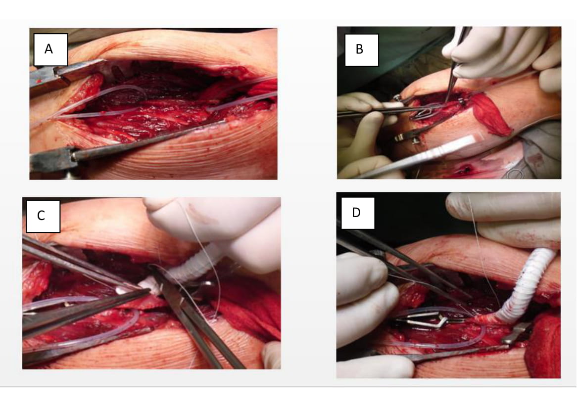 Arteriotomy was performed of 3.5 cm length followed by plasty with a portion of autovein of patch type, due to which the diameter of the artery was increased and tissue mismatch between the prosthesis and the artery was reduced (Figure 6).
