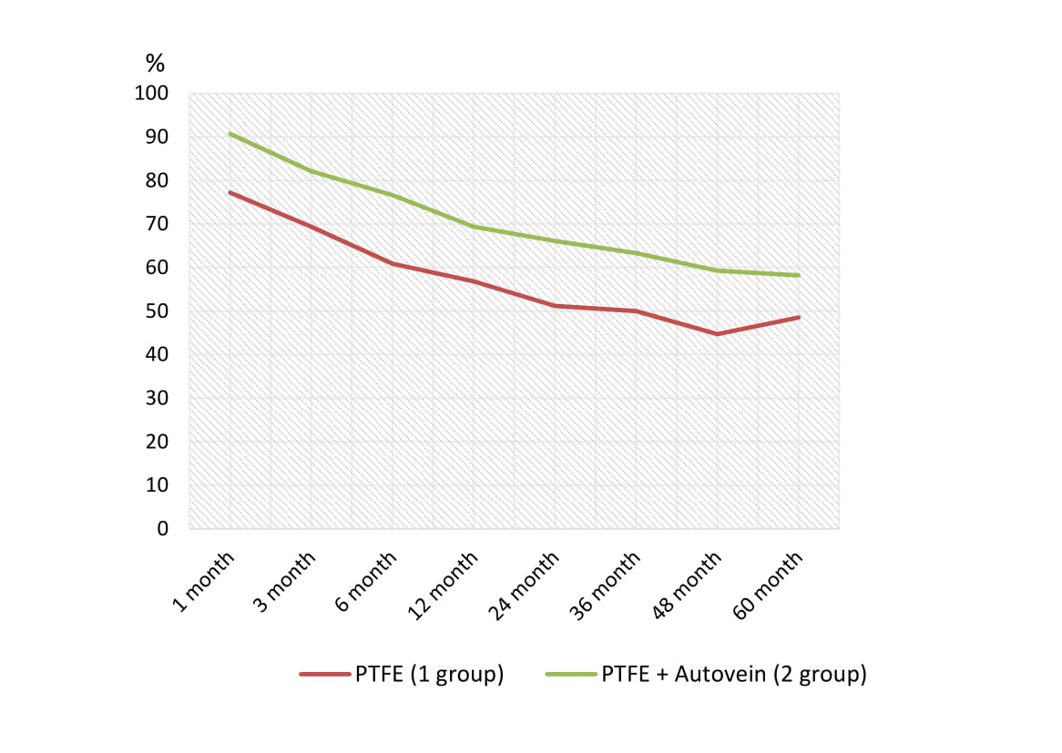 There is no significant difference between duration of the functioning of the autovein and the synthetic prosthesis in the early postoperative period. Probably, this is due to the fact that the causes of shunt thrombosis are technical errors of the operation. These often include changes in the geometry of the shunt, compression of the prosthesis, twisting of the intima, incorrect surgical tactics [9].