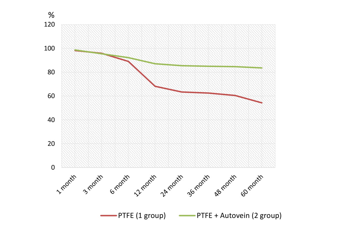 Autovein is superior to any material in terms of the duration of transplant functioning [3]. However, a common situation is absence of the autovein in result of repeated reconstructions, varicose dilatation, use of the vein for coronary artery bypass grafting (CABG), etc. A forced use of a synthetic prosthesis in such cases leads to long-term results comparable to use of the autovein only in case of application of a distal anastomosis above the knee-joint cleft [4]. The use of a synthetic prosthesis for femoral-popliteal bypass surgery includes the risks of a significant impairment of the results of interventions both in terms of prosthetic patency and limb salvage [5].