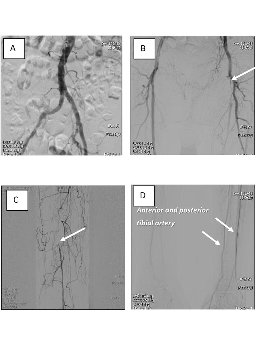 Fig. 5. Angiograms of patient M., 70 years old: А – aorto-iliac segment, without hemodynamically significant stenosis; B – occlusion of the superficial femoral artery (shown by arrow); C – hemodynamically significant stenosis of the popliteal artery (shown by arrow); D – shin arteries (shown by arrow), distal peripheral resistance evaluated as 3 points