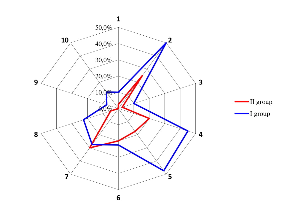 75.0% of pregnant women that participated in the study, were of average reproductive age (23-29 years old). A share of young first-time-mothers in I group was 10.0%, in II group – 15.0%, the share of age first-time-mothers was 17.5 and 10.0%, respectively. To note, a group of scientists headed by E.V. Prodanova had the same age groups of women in their study (2011) [8].