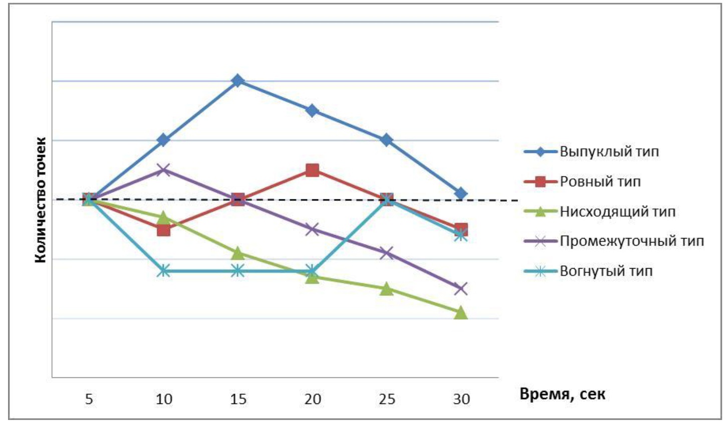 The strength of the NS was diagnosed by the form of the obtained curve of the graph of performance. As standards, four types of dynamics of the maximum speed of movement were used (Figure 1).