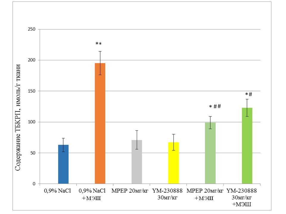 当研究自由基过程的强度时发现,与对照组相比,MESH治疗过程中大鼠大脑皮质内的脂质过氧化过程产物浓度增加了3倍以上(分别为195±19 nmol/g和63±11 nmol/g,p< 0.001)。MGlu受体拮抗剂(MPEP,20 μ/kg和YM -230888,10 mg/kg)在未施加最大电刺激的情况下,对大鼠大脑皮质硫代丙二酰缩脲产物水平无明显改变。我们发现,癫痫发作前1小时给药MPEP能显著但不是完全阻止最大电击引起的脂质过氧化产物含量的增加(图1,p<0.01)。MGlu1受体的选择性拮抗剂YM-230888也部分降低了最大电击引起的脂质过氧化过程的强化(图1,p<0.05)。