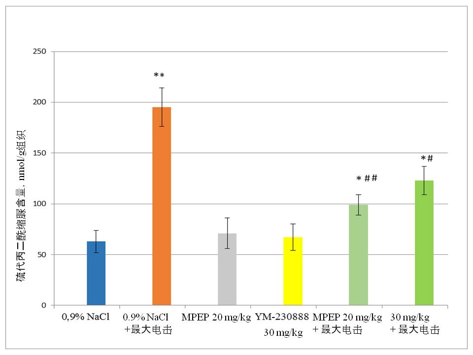 结果。研究发现,最大电击程序导致大鼠大脑皮质中明显的阵挛-强直性惊厥发作和脂质过氧化产物水平增加3倍以上。研究发现,第5亚型受体mGlu选择性拮抗剂几乎完全阻断大鼠癫痫发作的紧张期,并在很大程度上阻止了最大电刺激引起的脂质过氧化过程的强化。44%的实验动物在给予第1亚型选择性mGlu受体拮抗剂后出现强直性惊厥。同时,由于电击的作用,这种拮抗剂也部分降低了脂质过氧化产物的含量。