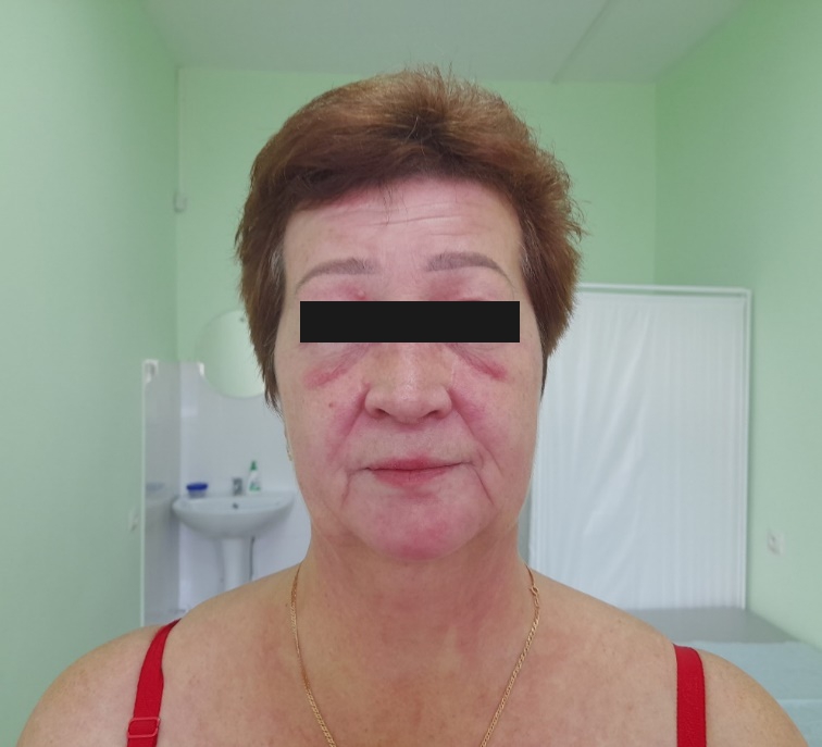 From the history, symptoms appeared about 6 months before, when the patient noted areas of redness on the skin of the upper and lower limbs, abdomen, chest, face. Then pain appeared in the muscles of the shoulder girdle, neck, hips. The patient repeatedly consulted a dermatologist, but the diagnosis remained unclear. After 6 months, she consulted a rheumatologist and was hospitalized in the rheumatology department with suspected dermatomyositis.