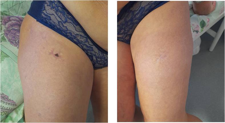 Fig. 3. Symmetrical ulcerative defects on the skin of the upper third of the thighs.