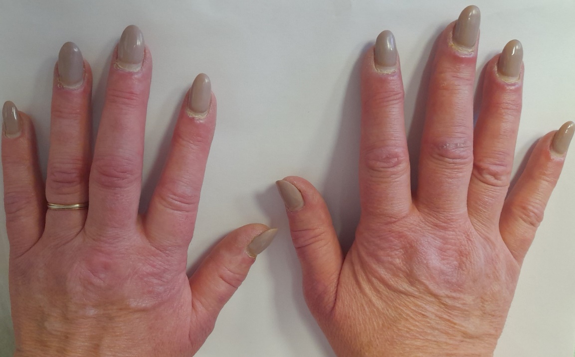 Fig. 4. Periungual erythema, ‘mechanic's hand’, Gottron papules.