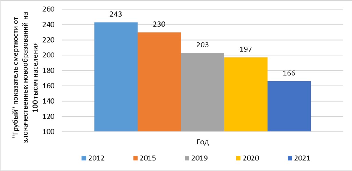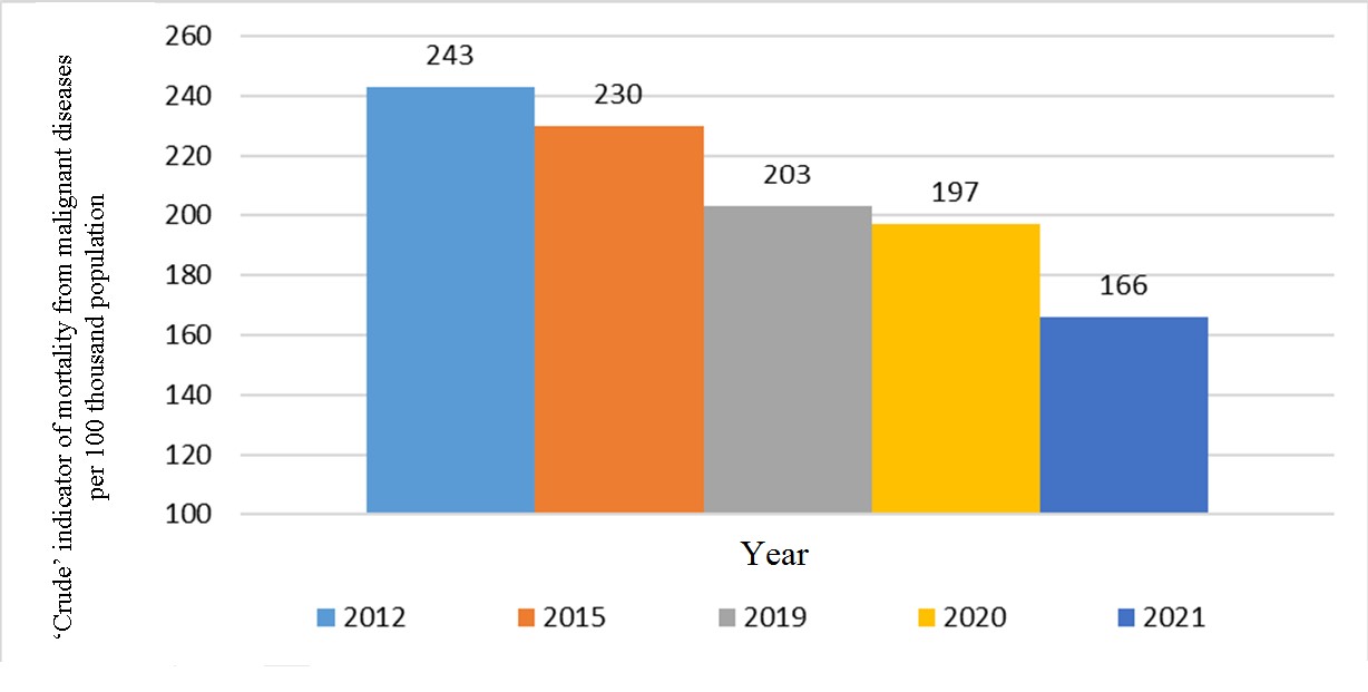 Fig. 2. Dynamics of ‘crude’ indicator of mortality form malignant neoplasms in the Ryazan region in 2012–2021.