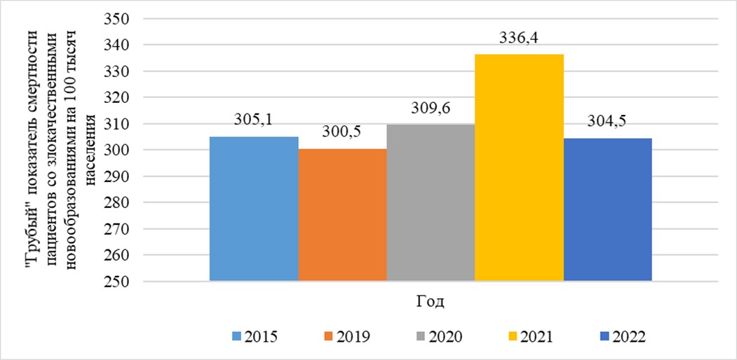 To note, the given statistics includes only patients, in whom the cause of death was direct progression and complications of the tumor process. Over the past decades, overall mortality rates from cancer in the Ryazan region have been showing a steady positive downward trend, including the period of the COVID-19 pandemic. However, taking into account additional information about deceased cancer patients, including those who died from non-cancer diseases, we can see the following graph (Figure 3).