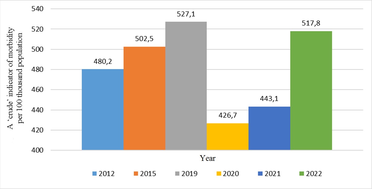 The most vivid statistical indicator is the overall morbidity with MNs. A ‘crude’ overall morbidity calculated per 100 thousand population in the period 2012–2019 fluctuated around 500 cases in the Ryazan region (Figure 1) [12]. Upon that, in 2020 and 2021 it declined to 426 and 443 cases, respectively, per 100 thousand population, that is, morbidity decreased by more than 15%–18%.