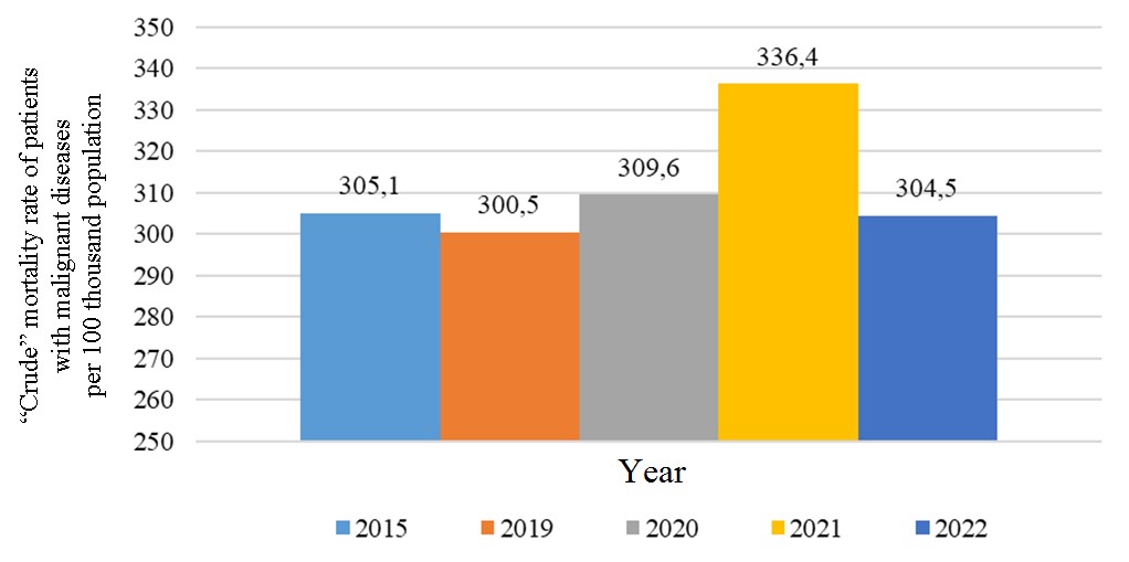 The analysis covered the period 2012–2022, of most interest undoubtedly being years 2020 and 2021 the height of the COVID-19 pandemic. Most relevant statistical indicators, in our opinion, were analyzed, such as ‘crude’indicators of incidence of MNs and mortality from them, including mortality fromnon-oncological diseases, the percentage of identified cases of I–II stage cancer and cancer in situ, per- centage of patients with IV stage of tumor process, percentageof actively identified patients, one-year mortality, the number of postmortem diagnoses at autopsy. These indicators were assessed in dynamics. Tumor ofsome most common and actual localizations were discussed separately.