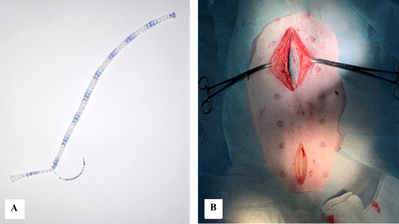 Fig. 1. A mesh thread, fixed in the eye of a surgical needle (A); laparotomy approach (B).