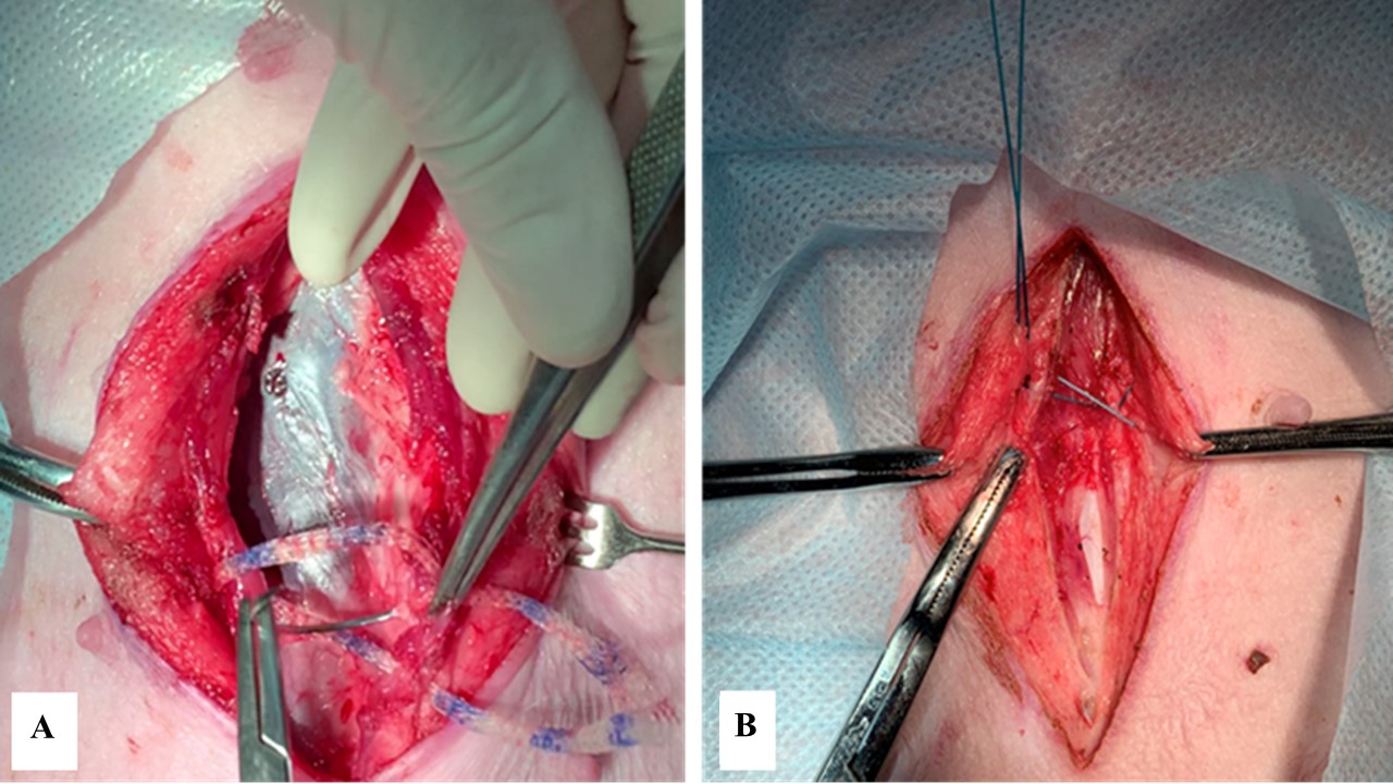 At the first stage of the experiment in all animals, two midline laparotomy wounds were made under general anesthesia following aseptic technique: one 10–12 cm long incision above the umbilicus, and the other 5–7 cm long incision below the umbilicus (Figure 1B).
