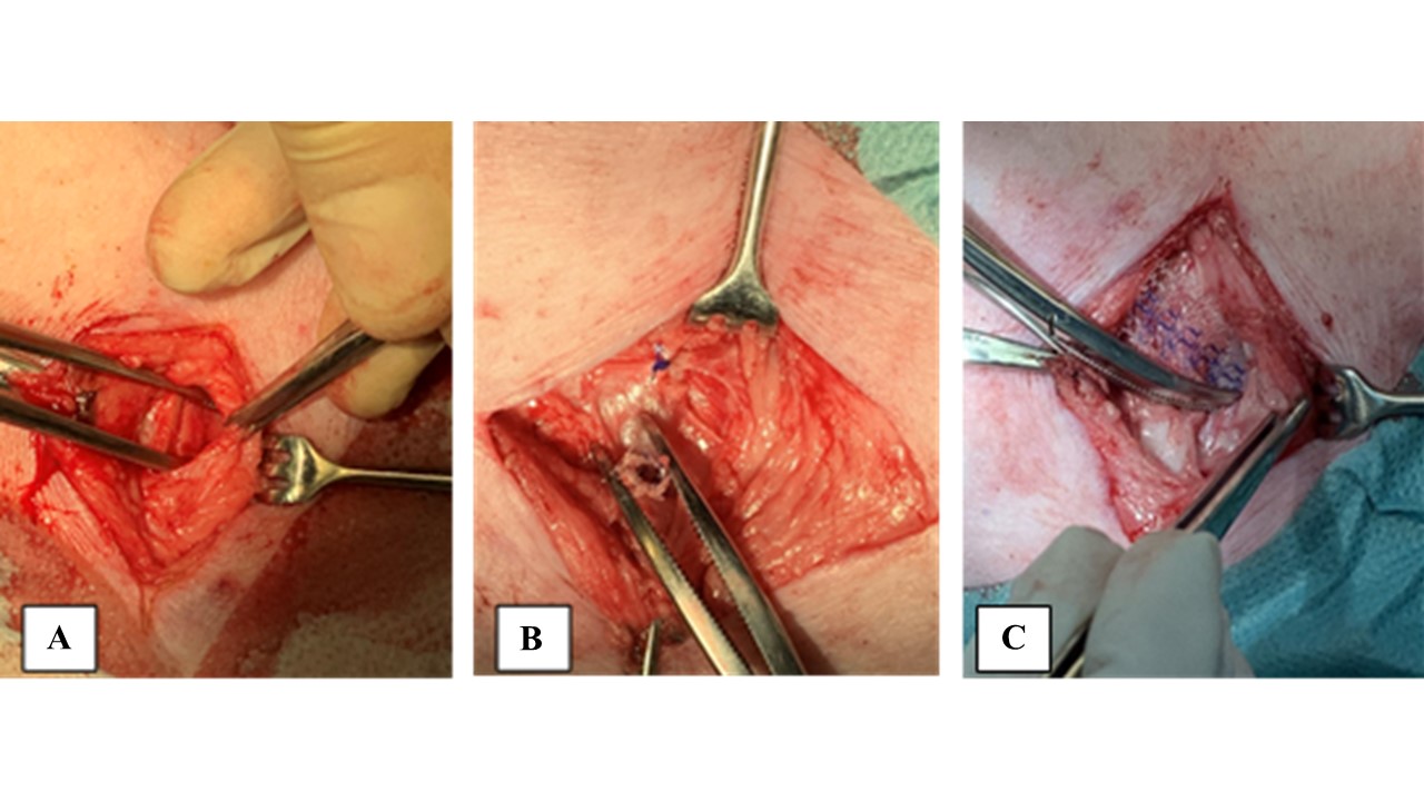 Fig. 4. View of the surgical wound: isolation of the retromuscular space (A), implantation of a mesh thread into the retromuscular space (B), implantation of a strip of mesh endoprosthesis (C).