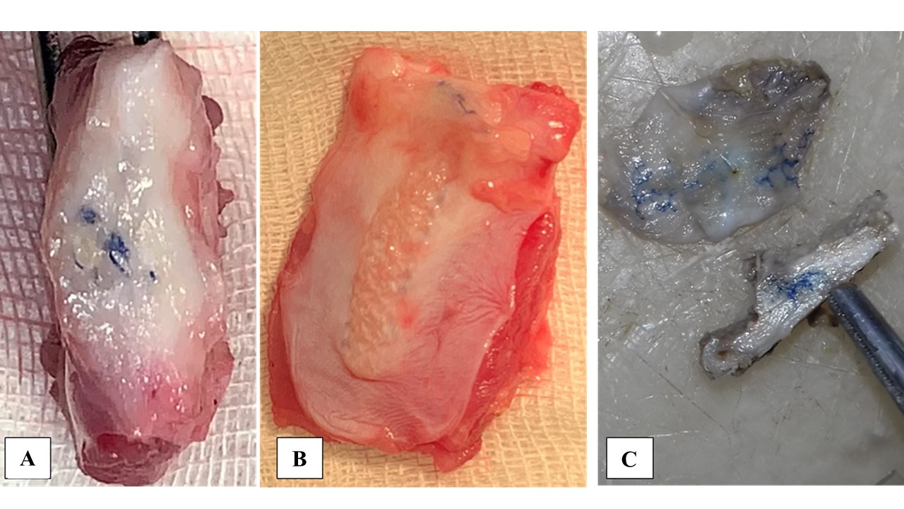 Fig. 5. Surgical material: a scar 60 days after the application of a reinforcing suture with a mesh thread (A); mesh thread 14 days after implantation (B); a strip of a mesh implant (above) and a scar after application of a reinforcing suture with a mesh thread (below) on day 14 (preparation to histological examination) (C).