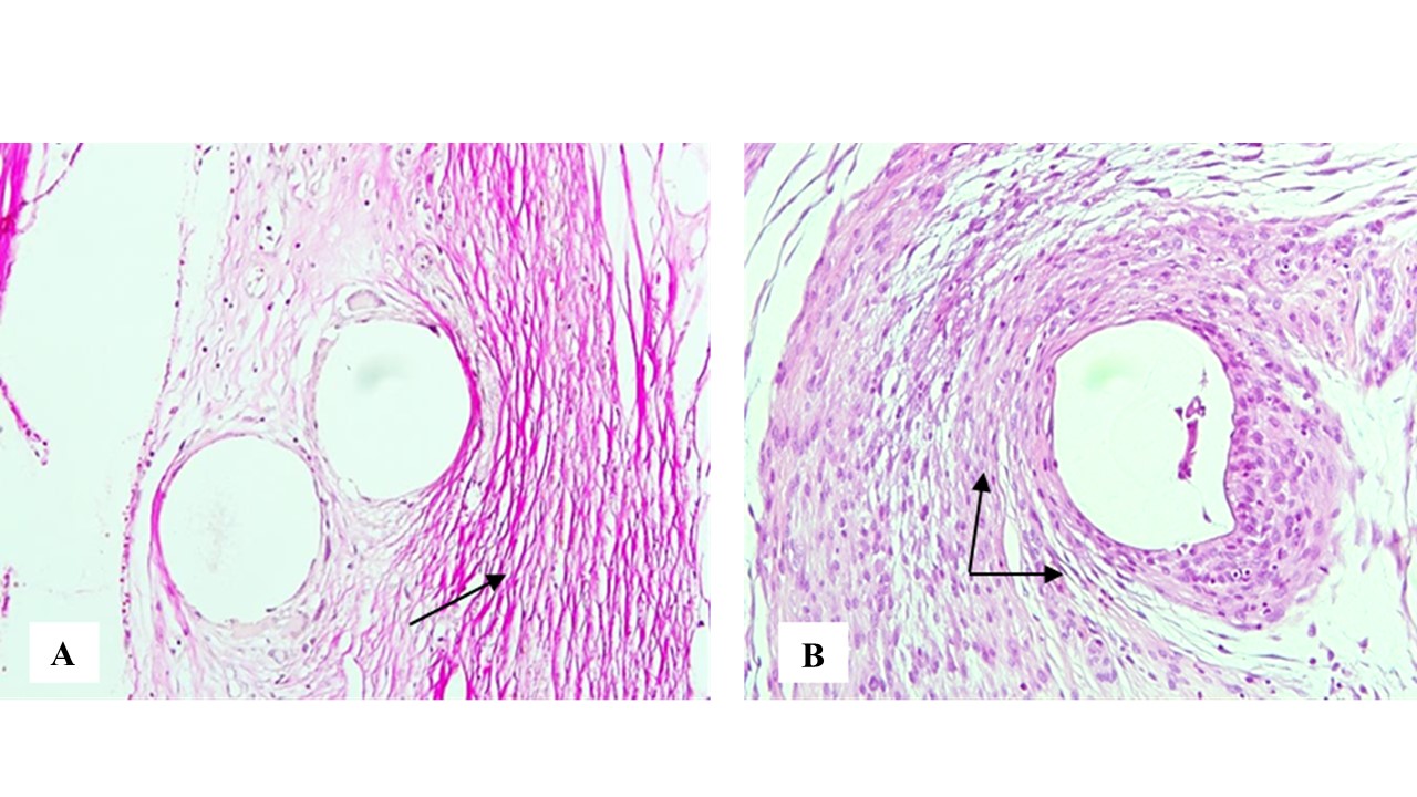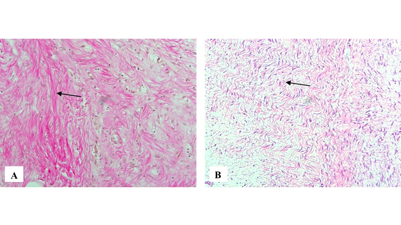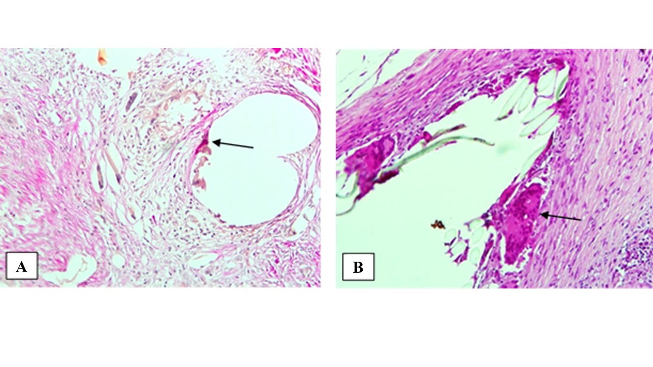 The obtained pieces of tissues were fixed in 20% solution of neutral formalin. Histological examination was carried out on paraffin sections of 5 μm thickness and stained with hematoxylin and eosin and van Gieson. Photographs were taken at ×200 and ×400 magnifications on LeicaDM microscope with Leica camera.