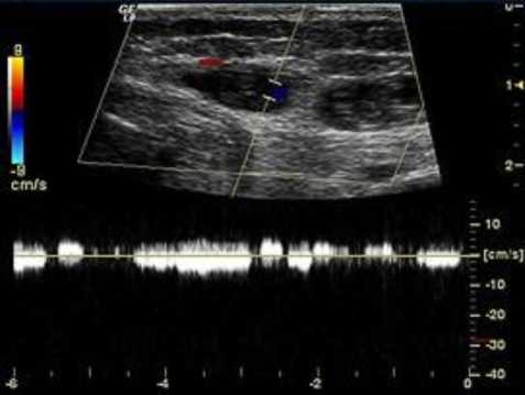 Fig. 1. Duplex scanning of angiomatous tissues. Venous caverns with low-velocity blood flow based on the Doppler curve data