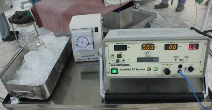 In our clinical practice, we used radio-frequency Cool-tip RF Ablation System (Valleylab, Covidien, USA, Figure 2) coagulator. The device is operated by a specially trained person who controls the electrode temperature, and temperature and impedance of tissues. Before the surgery, the operator prepared a container with crushed ice and placed it into a flask that contains physiological saline. The tubes from the flask were directly connected to the radiofrequency catheter. During the surgery, the physiological saline circulates through the tubes, cooling the catheter and preventing its excessive heating. As a rule, for any interventions, ablation with a single electrode kit E catheter is used in lesions 15 cm in length and the length of the operating part was 1-2 cm depending on the volume of lesion.