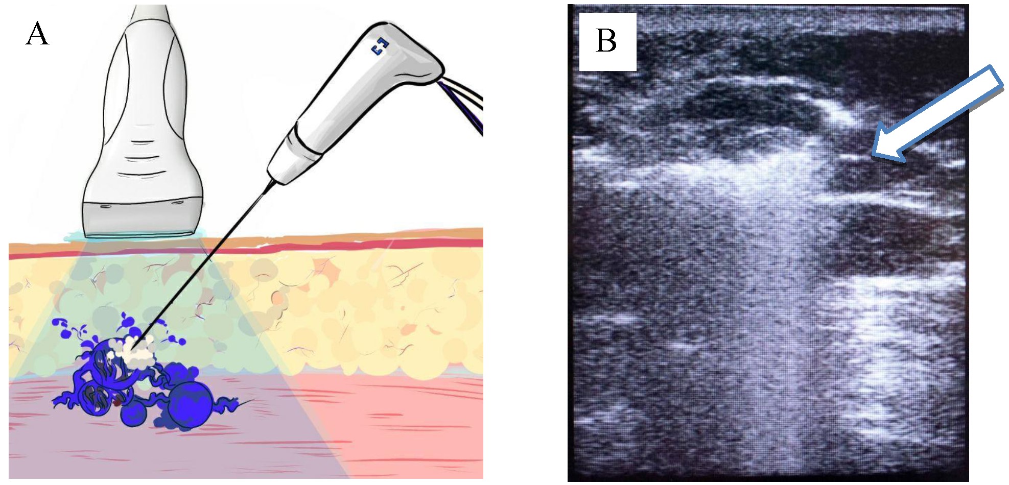 Fig. 3. Surgical intervention with ultrasound (US) control (A) and the results of US examination in B-mode (B). Echo-positive signals in the radiofrequency ablation zone (arrow)